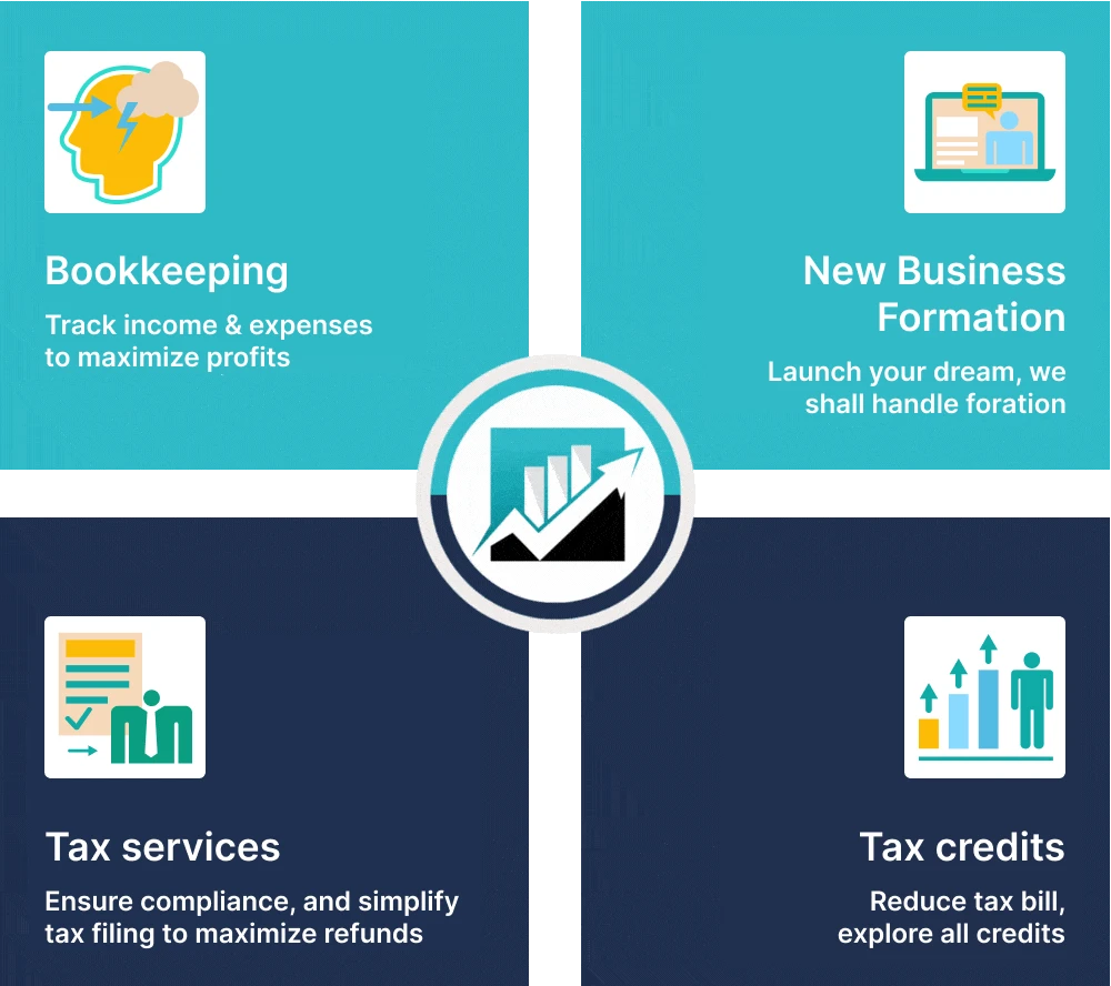 We deal in Tax Returns, Tax Credits, Financial Books Management, New Entity Formation, and much more for startups, small and growing businesses